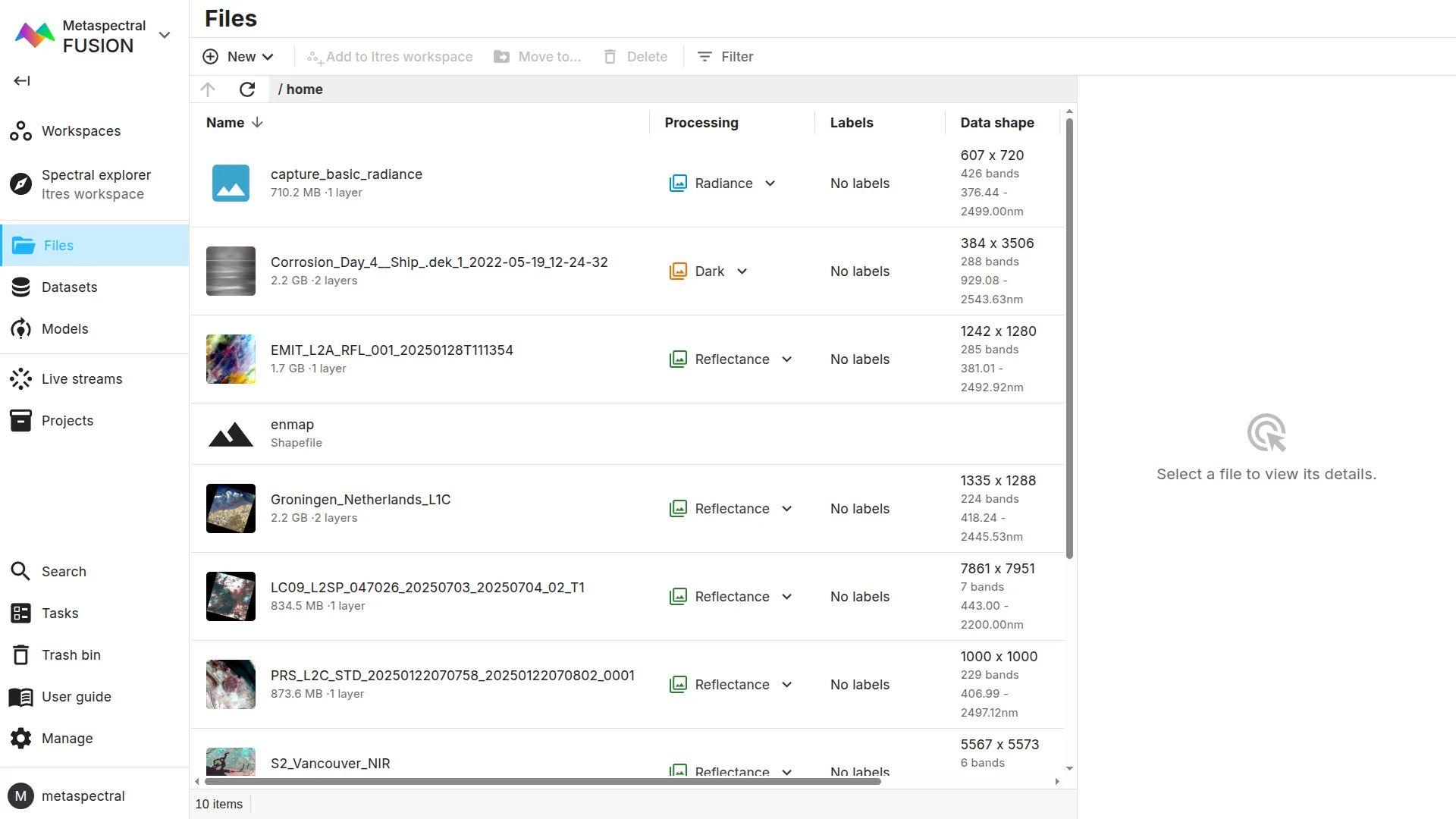 FilesOverviewOverview The Clarity Files page lets you manage your hyperspectral data. Use the sections below to get started: Upload Data Process Hyperspectral Data Generate Color Composites Band Math Searching for Data
