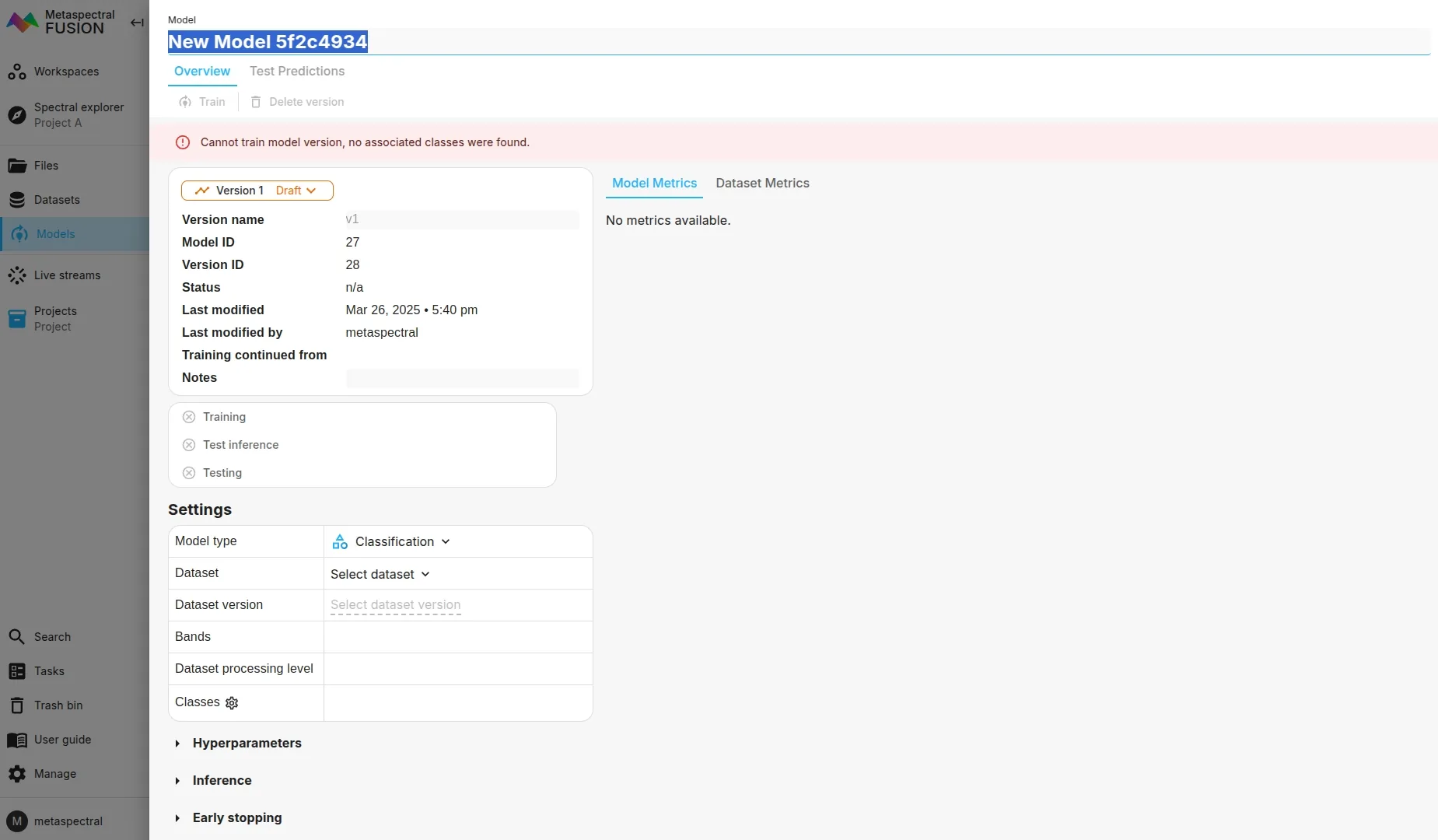 - Model Type: Choose from Classification, Unmixing, Target Detection, or Regression